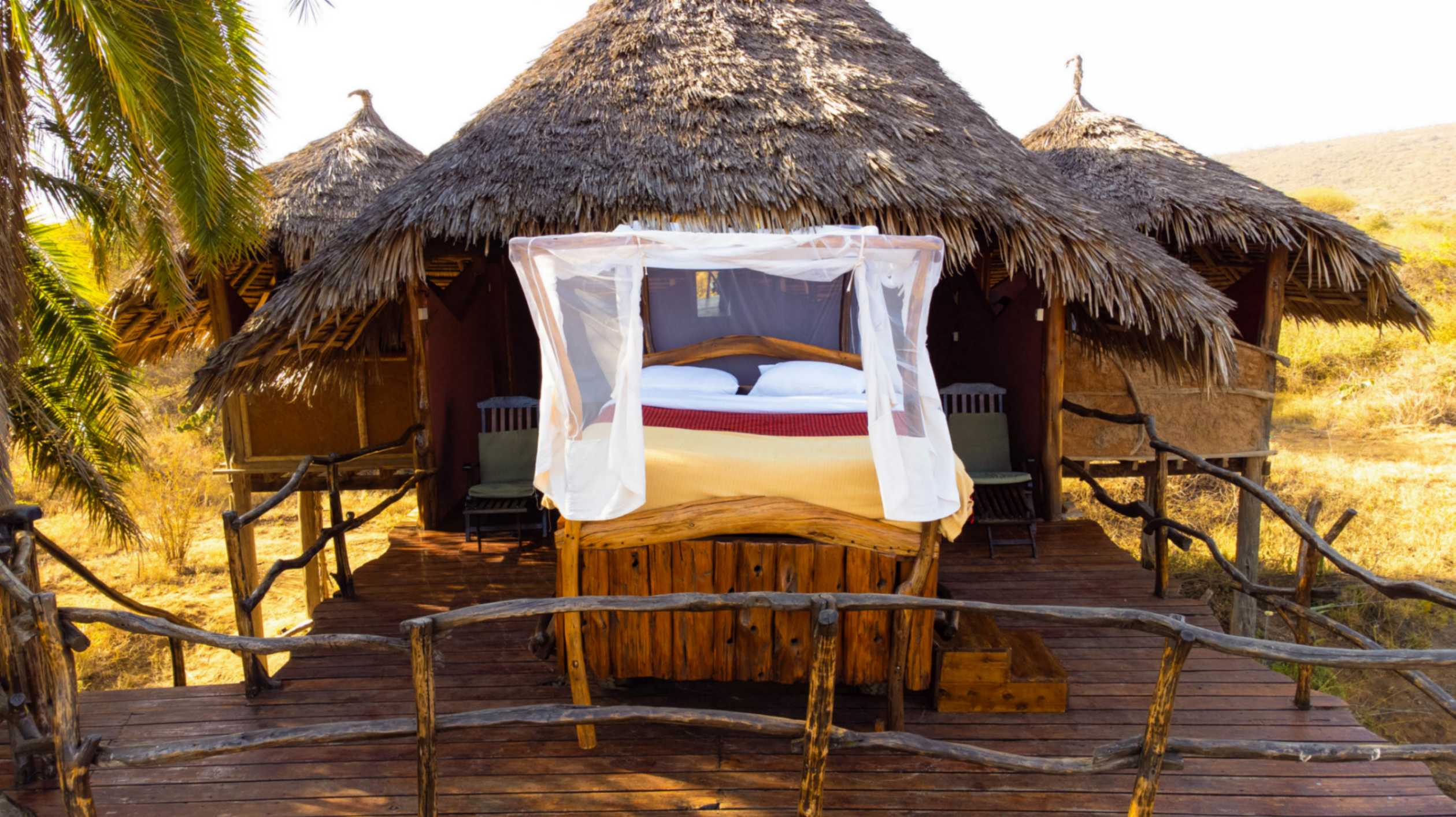 The Koija Starbeds are something really very special. They are set on raised platform overlooking the mighty Ewaso Nyiro river and the landscape beyond. The room is partly covered by a thatch roof, under which rests the weirdest sleeping contraption you’re ever likely to encounter.